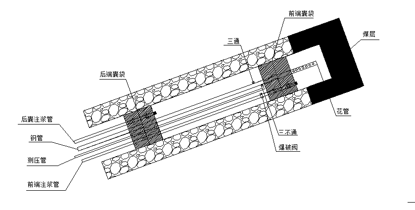 4、帶壓注漿。連接注漿泵及注漿管路,并用清水實驗泵及管路是否正常,確認正常后將封孔劑與水按照質量比1:1比例混合均勻,啟動注漿泵向孔內注漿。漿液率先注入孔底兩個囊袋內,待囊袋充起并濾水凝固后,注漿壓力達到0.6MPa左右,此時爆破閥爆破,漿液自行注入鉆孔中間密封腔,待漿液從回漿管持續返出時,關閉回漿管閥門,并繼續向孔內加壓注漿,直至注漿壓力達到1.5-2MPa時,停止注漿;